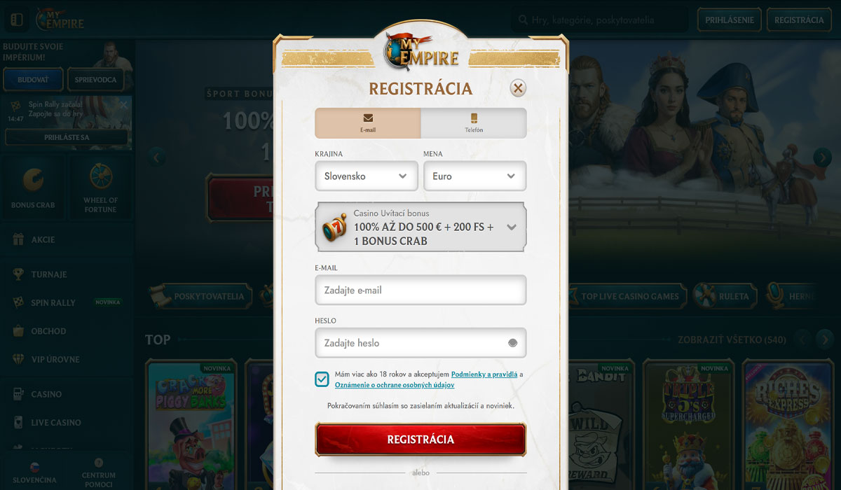 MyEmpire Casino je moderná a rýchlo rastúca online casino a stávková platforma, ktorá bola spustená v roku 2023 a je vlastnená a prevádzkovaná spoločnosťou Rabidi N.V., držiteľom licencie u Antillephone N.V. (Anjouan, licencia 8048/JAZ), ktorá riadi jej medzinárodnú prevádzku a zabezpečuje regulované hranie a zabezpečenie pomocou SSL šifrovania. MyEmpire, navrhnuté s pohlcujúcou témou Rímskej ríše, poskytuje obrovskú hernú knižnicu, ktorú priemyselné zdroje odhadujú na tisíce titulov – od 900+ do viac ako 12 000 hier, vrátane online automatov, progresívnych jackpotov, klasických stolových hier, instantných / rýchlych hier a rozsiahlej sekcie živého casina so živou ruletou, blackjackom, baccaratom, pokrom a game show od popredných poskytovateľov. Platforma tiež integruje sekciu športového stávkovania tam, kde je to povolené, ponúka trhy na futbal, basketbal, tenis, esporty a ďalšie športy so stávkovaním pred zápasom aj počas hry. Hráči môžu začať hrať s minimálnym vkladom zvyčajne od 10–20 EUR v závislosti od platobnej metódy, vrátane tradičných možností a kryptomien, a minimálne výbery sú podobne dostupné, hoci konkrétne prahy sa líšia podľa metódy; boli zaznamenané aj týždenné limity výberov okolo 7 000€. Výplaty cez e-peňaženky sú zvyčajne spracované rýchlo (často do 24 hodín), zatiaľ čo transakcie kartami a bankovými prevodmi môžu trvať až 3–5 pracovných dní a väčšie výbery môžu vyžadovať štandardné KYC overenie (ID a doklad o adrese) v súlade s pravidlami proti praniu špinavých peňazí. MyEmpire podporuje viacero mien vrátane eur a kryptomien, prevádzkuje VIP / vernostný program s výhodami, ako sú zvýšené limity a cashback, a jeho plne mobilne optimalizované webové stránky umožňujú hráčom pristupovať k plnej sade hier a stávkových funkcií na počítačoch aj moderných smartfónoch bez nutnosti samostatnej aplikácie.