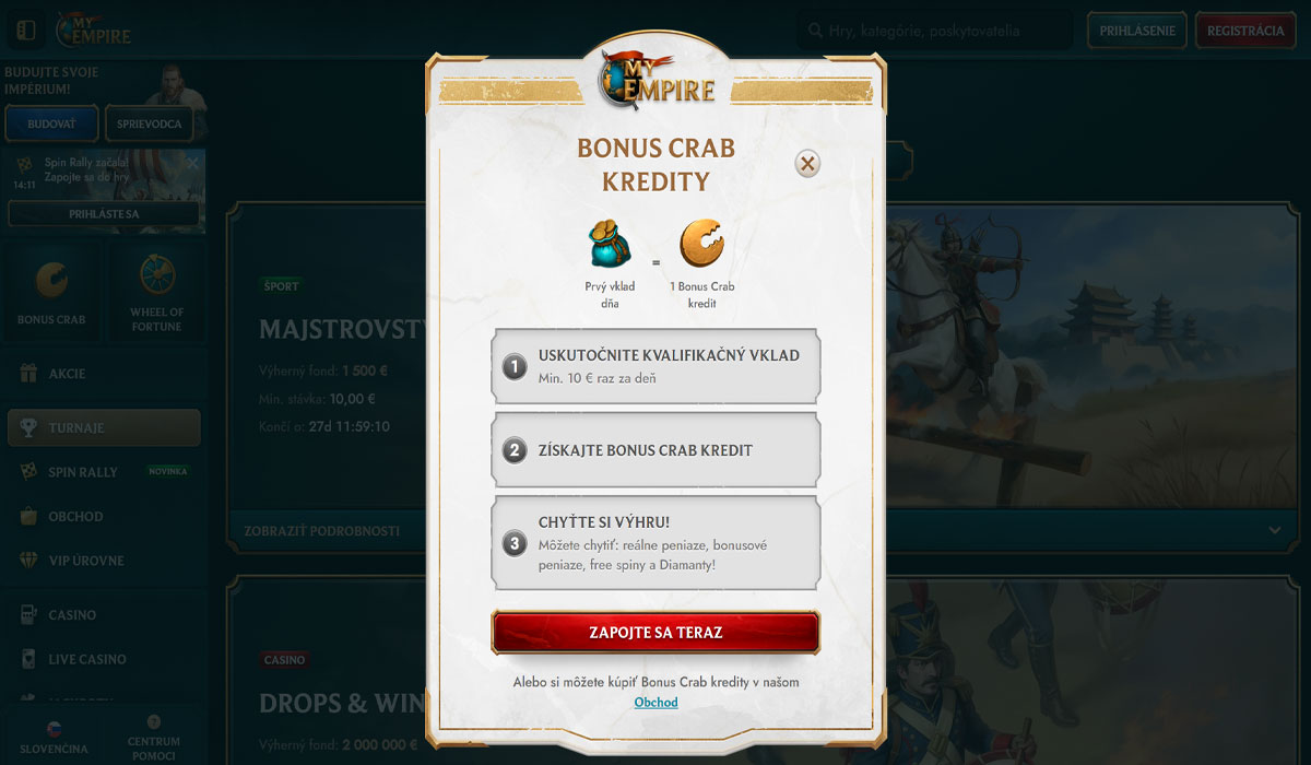 Minimálny vklad v MyEmpire Casino je všeobecne nízky, čo slovenským hráčom umožňuje začať hrať s malou sumou, aj keď presné limity sa môžu líšiť podľa platobnej metódy (od 10 eur do 20 eur).