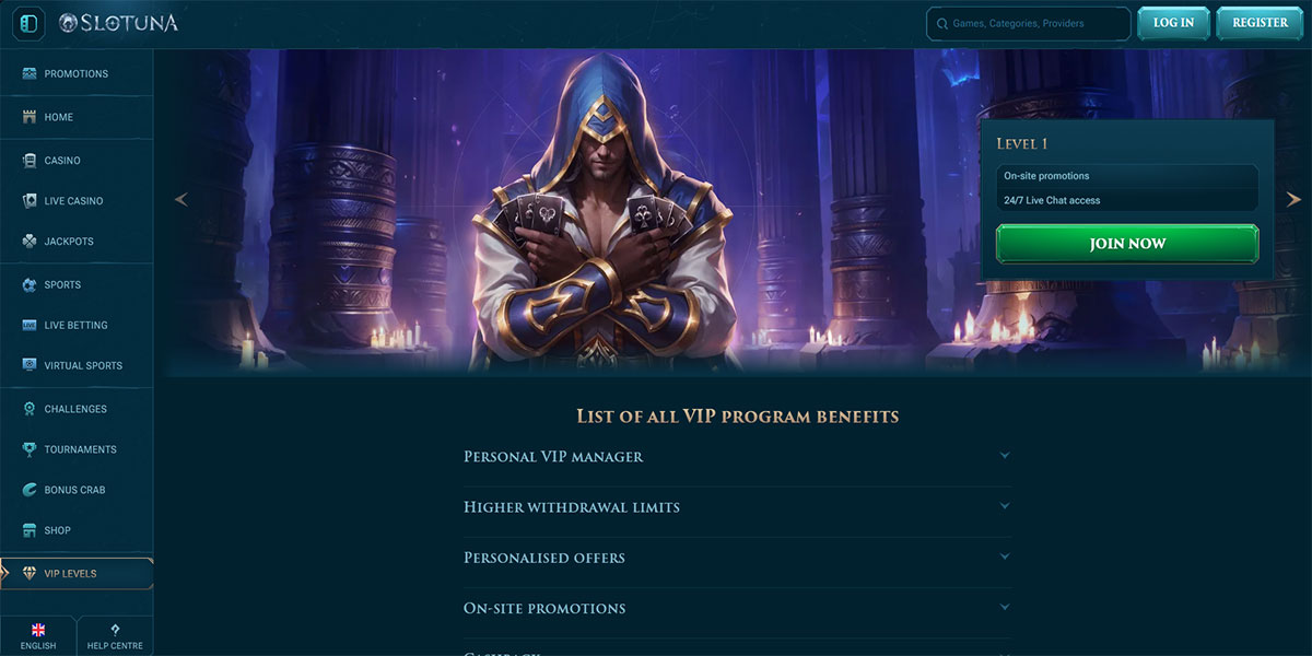 Kasíno Slotuna, spustené v roku 2024, sa prezentuje ako moderná online kasínová a stávková platforma navrhnutá s dôrazom na jednoduchosť a hrateľnosť. Platforma kombinuje širokú kasínovú ponuku – zahŕňajúcu automaty, stolové hry, tituly so živými dealermi a jackpoty – s integrovanou sekciou športovej knižnice obsahujúcou tradičné športové trhy, živé stávkovanie a virtuálne športy. Slotuna kladie dôraz na čistý dizajn, responzívnu navigáciu a na funkcie bohaté rozvrhnutie, ktoré vyhovuje hráčom hľadajúcim kasínovú zábavu aj športové stávkovanie na jednom mieste.